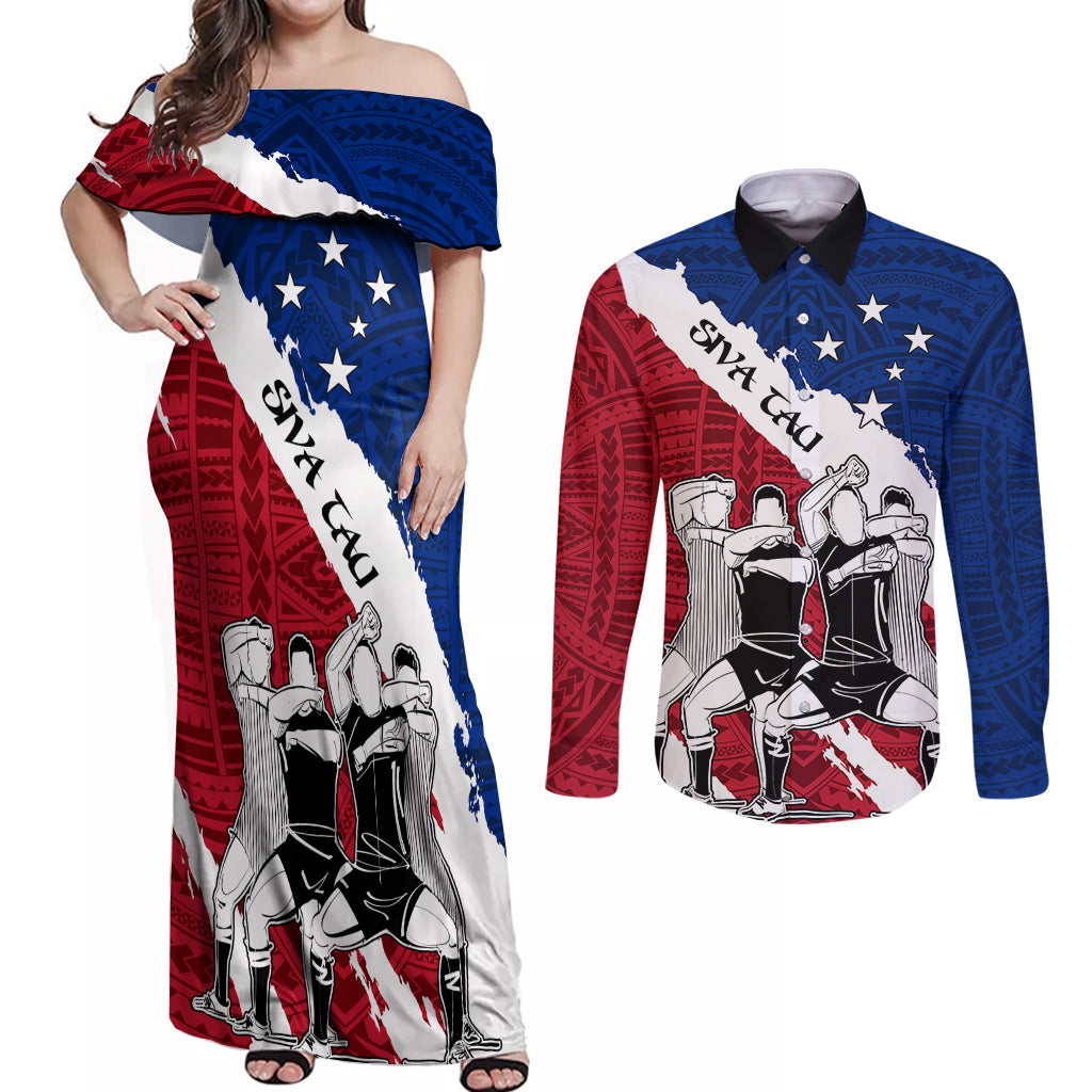 Custom Samoa Rugby Couples Matching Off Shoulder Maxi Dress and Long Sleeve Button Shirts Siva Tau Dance Polynesian Tattoo Brush Style LT03