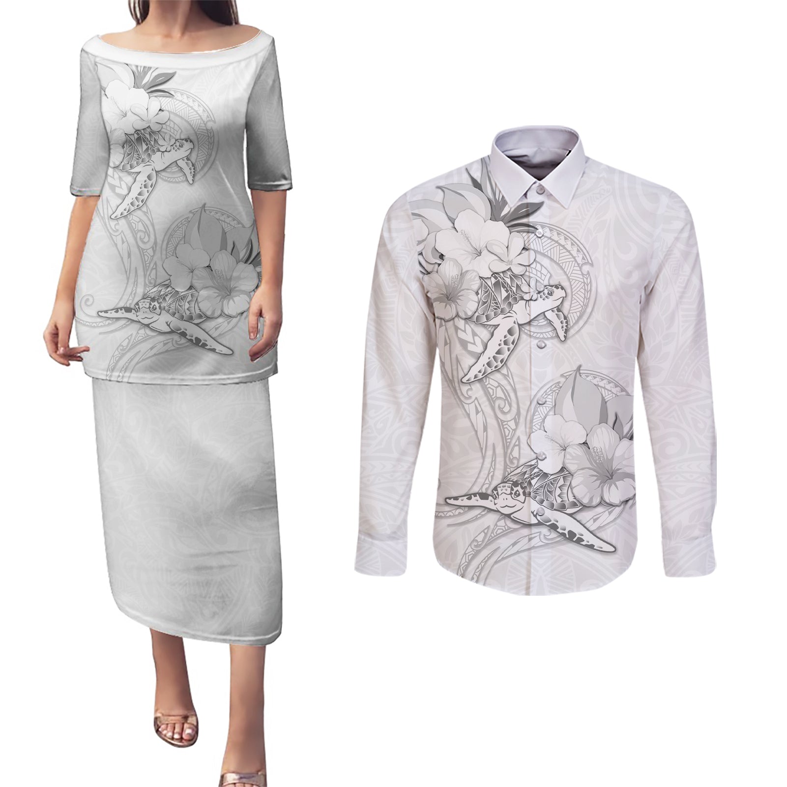 Polynesia Sea Turtle Couple Couples Matching Puletasi Dress and Long Sleeve Button Shirt Happy Valentine Day White LT05