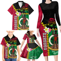 Vanuatu Nakamal and Plumeria Flowers Family Matching Long Sleeve Bodycon Dress and Hawaiian Shirt Polynesian Pattern